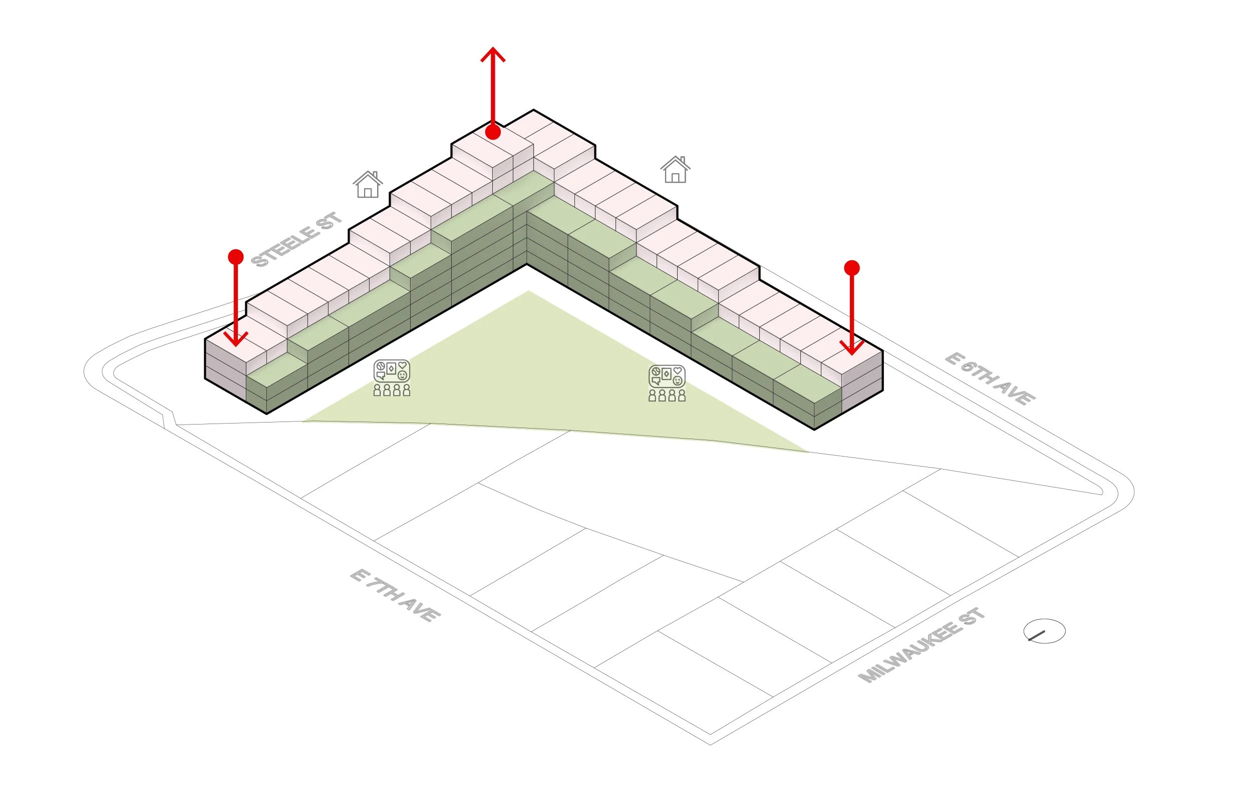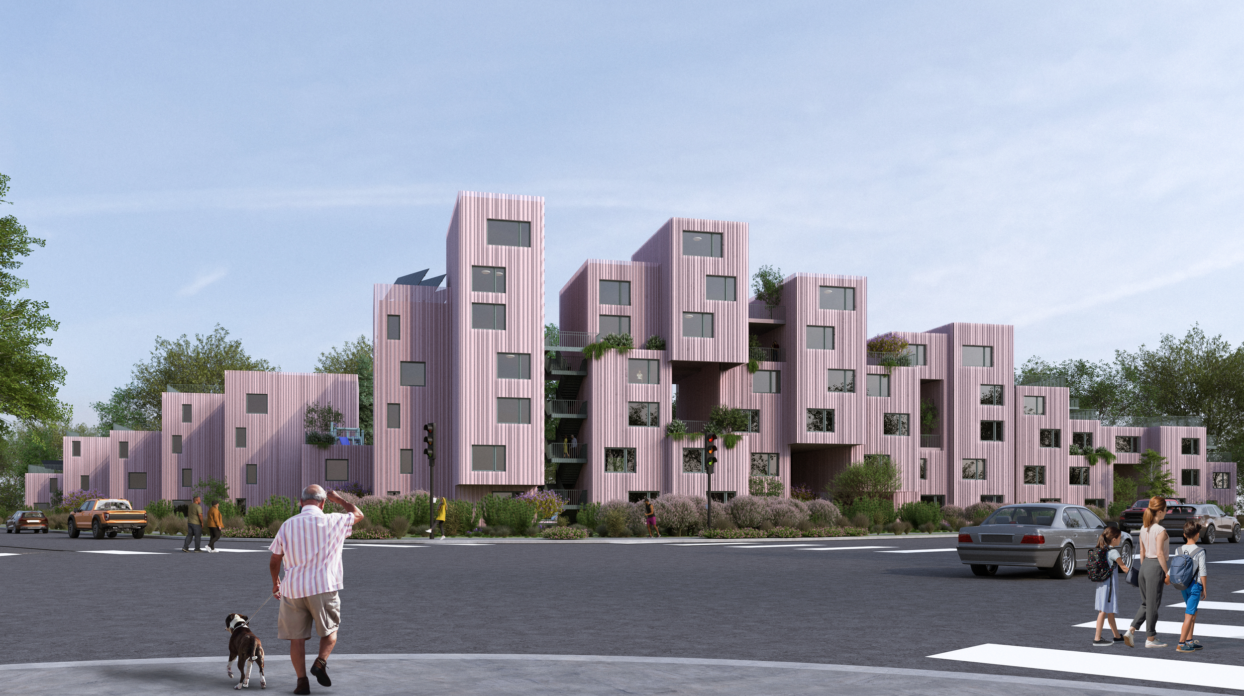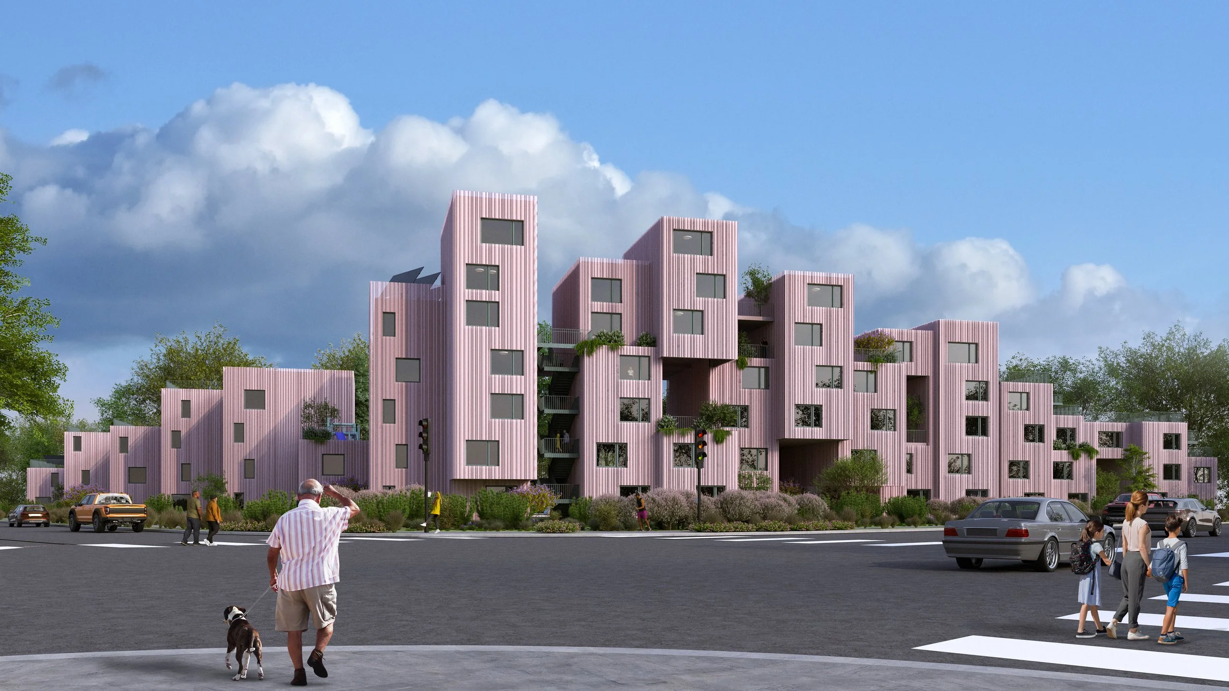 Sited along the I-70 corridor, where infrastructure once divided Park Hill and Elyria-Swansea, the project reclaims the highway edge as a new framework for collective life. Instead of a single monolithic block, the housing grows as a series of prefabricated units, stacked and shifted to form courtyards, gardens, and elevated terraces.