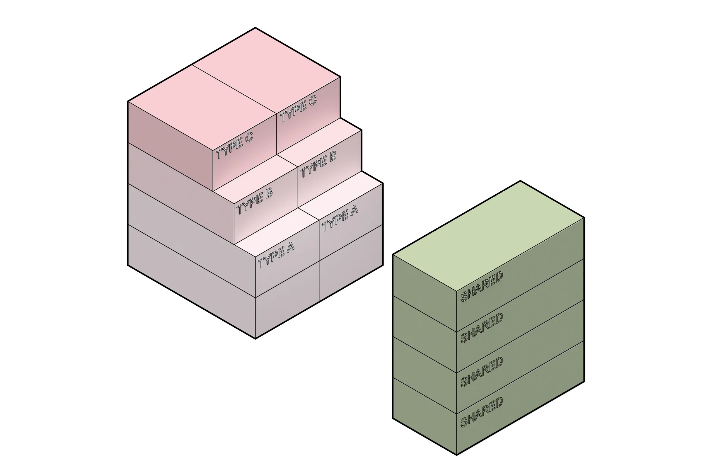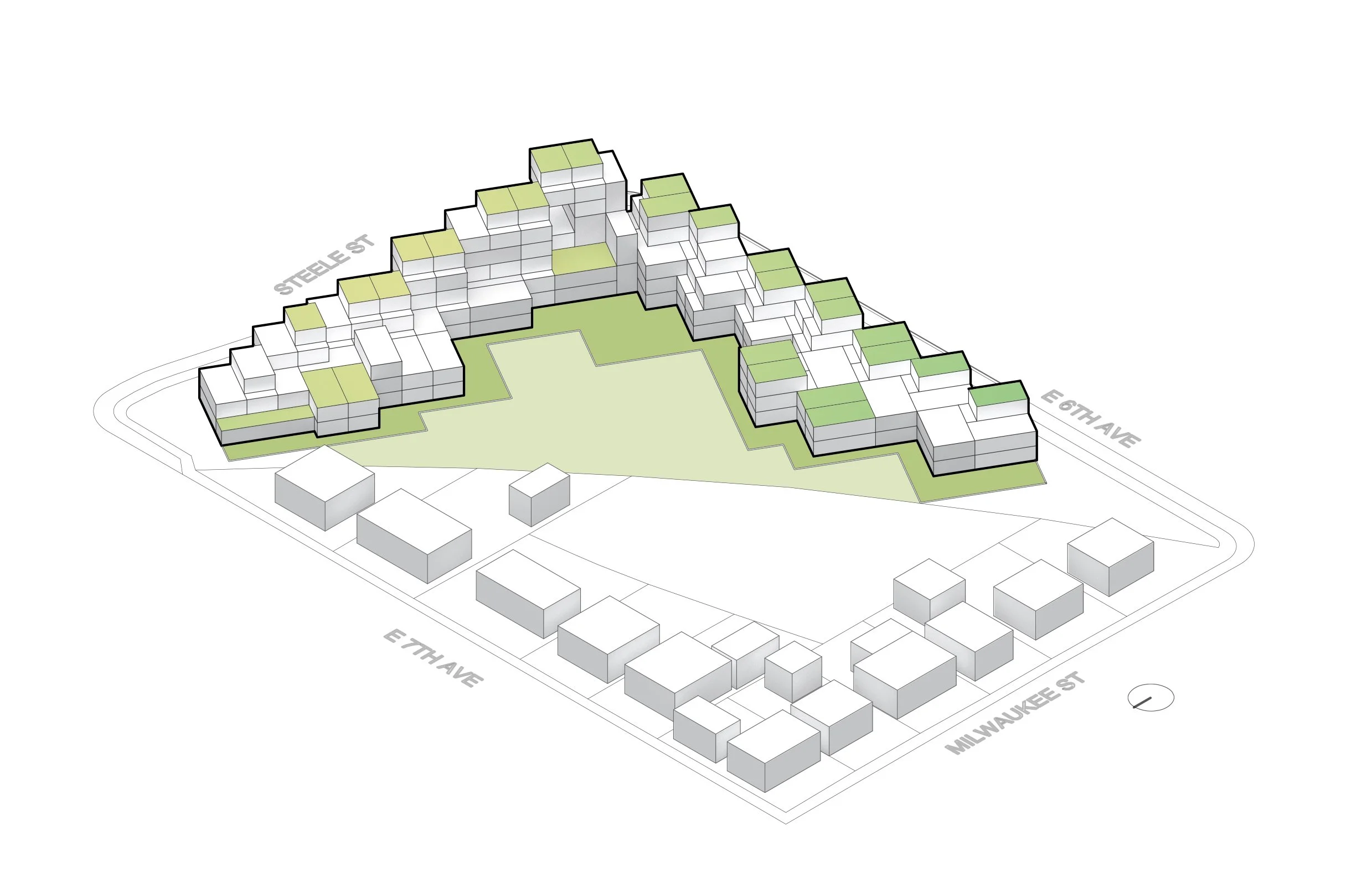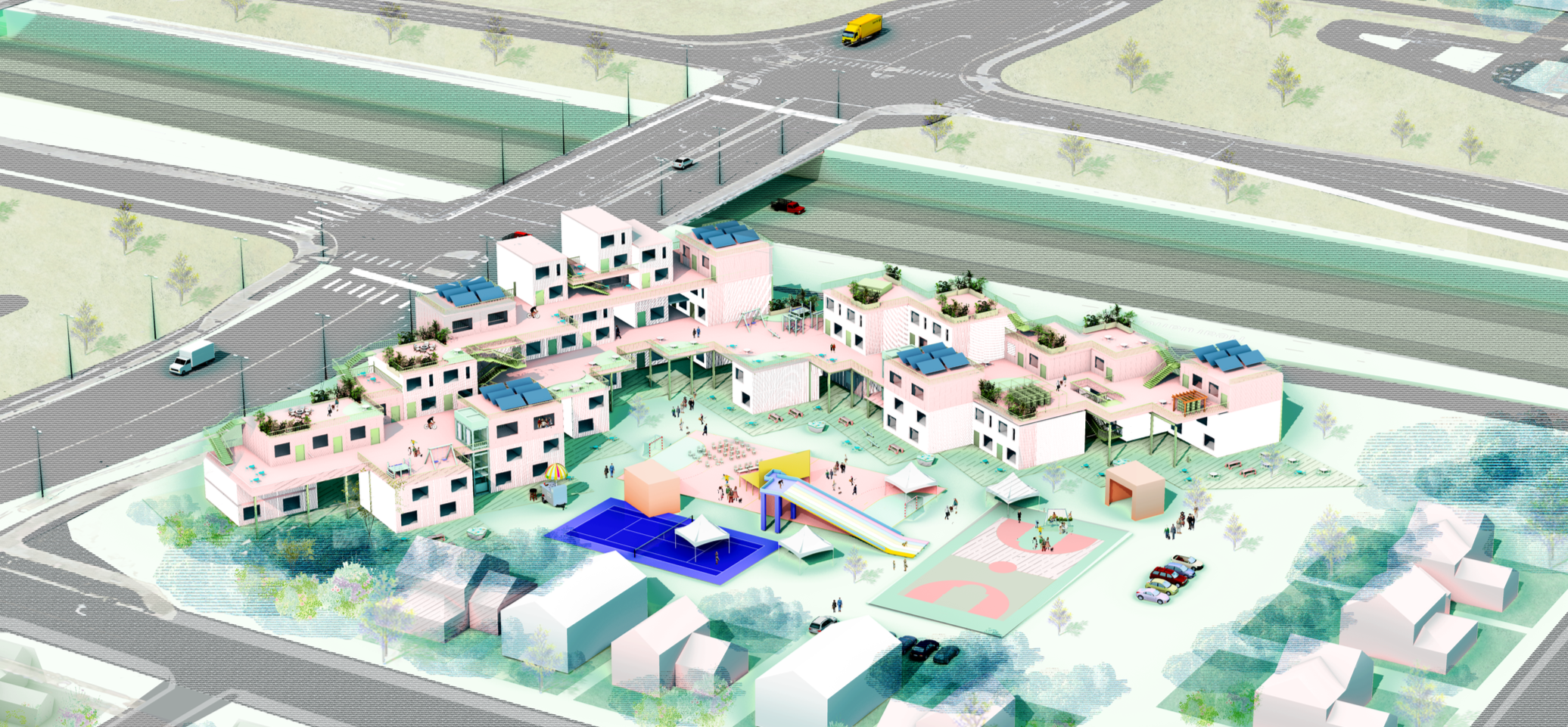 Sited along the I-70 corridor, where infrastructure once divided Park Hill and Elyria-Swansea, the project reclaims the highway edge as a new framework for collective life. Instead of a single monolithic block, the housing grows as a series of prefabricated units, stacked and shifted to form courtyards, gardens, and elevated terraces.