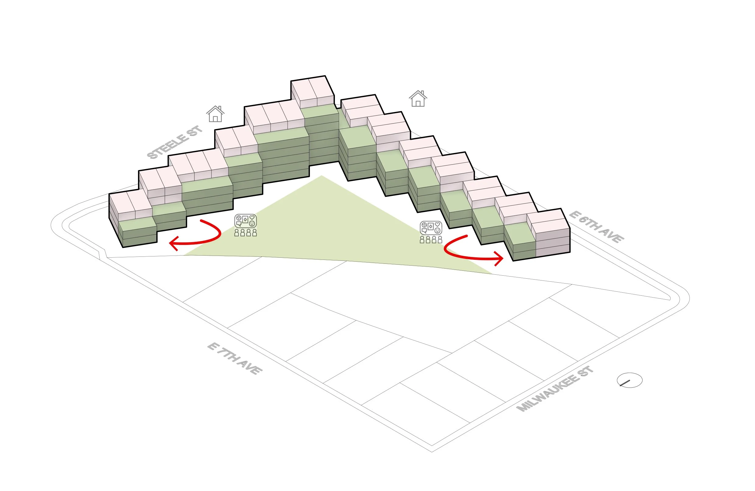 These courtyards and public fields — playgrounds, gardens, and ground-floor classrooms— stitch together the fractured fabric, turning leftover land into shared neighborhood ground. The prefabricated system allows phased construction, local assembly, and adaptability over time, aligning with Denver’s push for equitable, resilient, and rapid affordable housing.